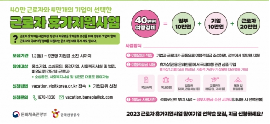 근로자 휴가지원 사업은 직장인들의 일과 삶의 균형을 도모하고 국내 관광 활성화를 위해 문화체육관광부가 2018년부터 시행해온 획기적인 지원 정책입니다.