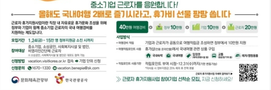 중소기업 등 근로자 15만명에 정부·기업이 근로자 휴가비 20만원을 지원합니다.