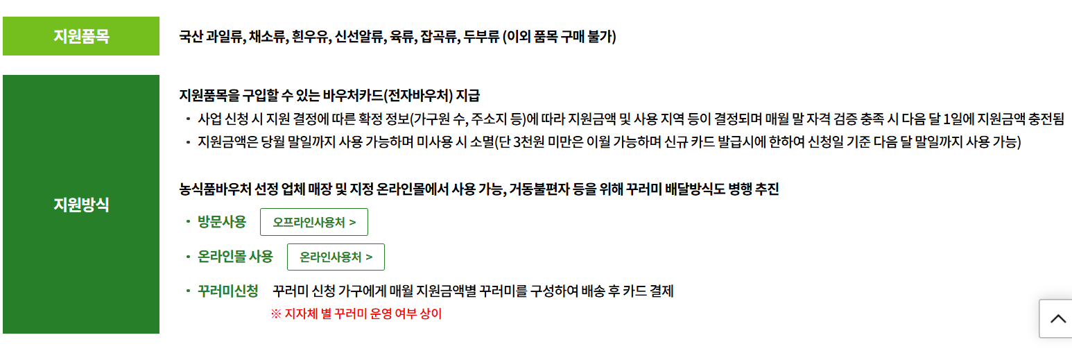 이 바우처는 신선한 농산물, 즉 , 채소, 과일, 쌀 등의 구입에 사용 가능하며, 특정한 제약이 없는 범위 내에서 이뤄집니다. 또한, 바우처의 사용은 정해진 기간 동안 이루어지며, 그에 따라 월별로 정해진 금액이 지급됩니다.