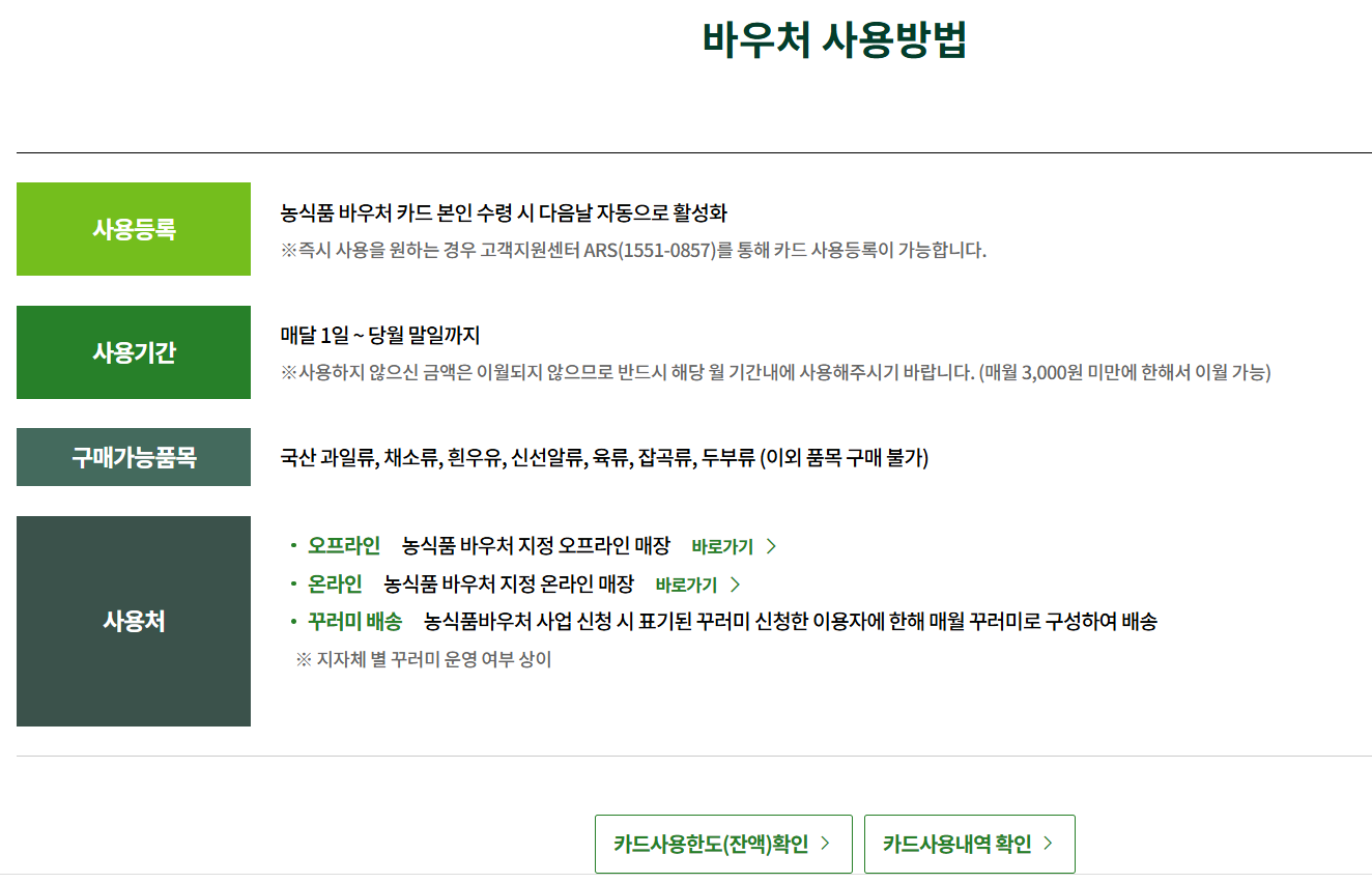 또한, 바우처 사용처는 농협 하나로마트, 지역 농산물 직매장, 전통시장 등 다양한 지정 판매처에서 사용할 수 있도록 운영됩니다.