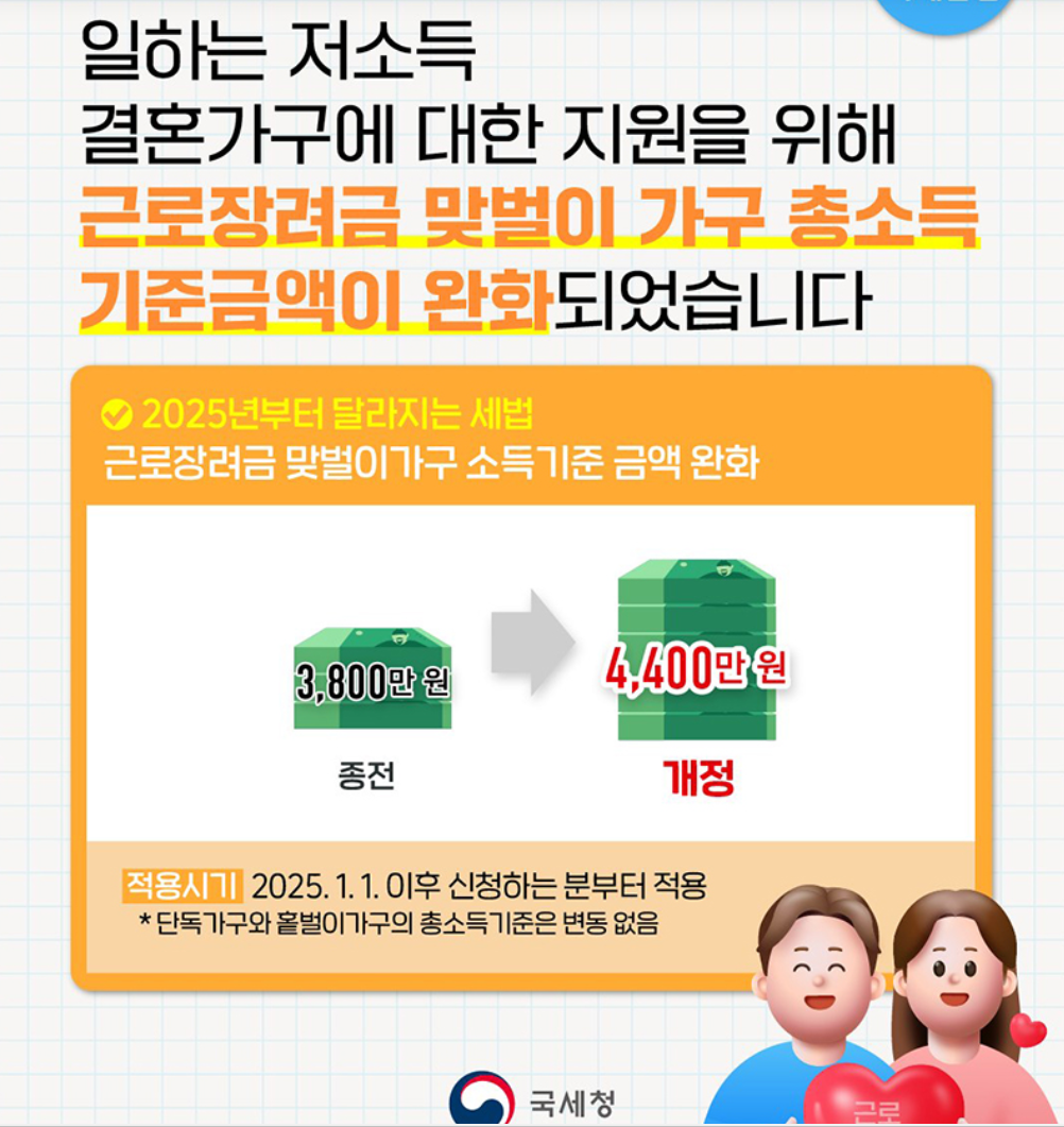 특히, 일하는 저소득 결혼가구에 대한 지원을 위해 근로장려금 맞벌이 가구 총소득 기준금액이 완화되었습니다.