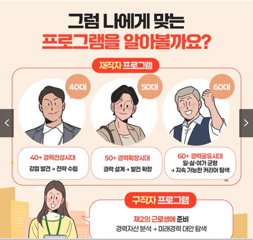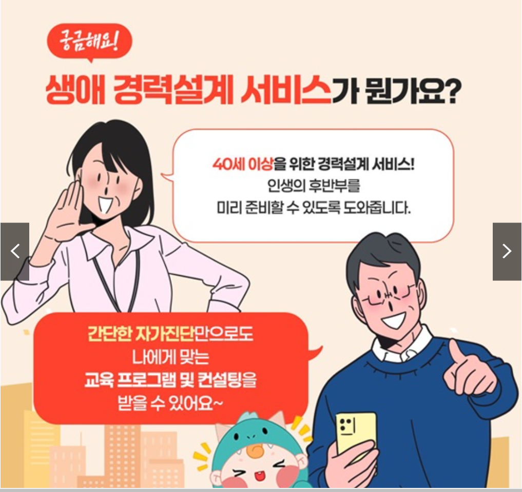 이에 고용노동부에서는 생애 경력설계 서비스를 통해 40세 이상 재직자 및 구직자가 인생 후반부를 준비할 수 있도록 돕고 있습니다.