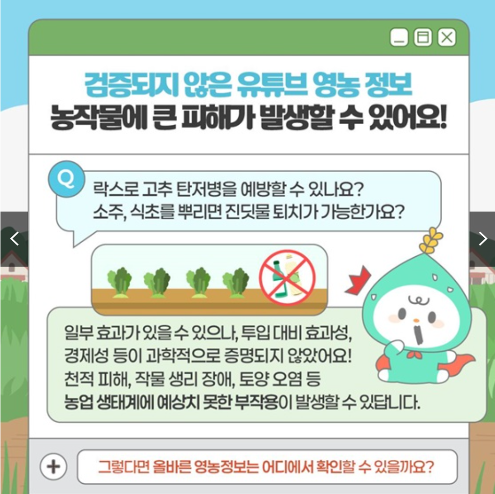 농사를 짓거나 가정에서 텃밭을 가꾸다 보면 다양한 농작물 재배 방법이나 병해충 방제법이 궁금해질 때가 많습니다. 최근 유튜브에는 수많은 영농 정보 영상이 올라오고 있는데, 과연 그 정보들은 믿을 수 있을까요?
